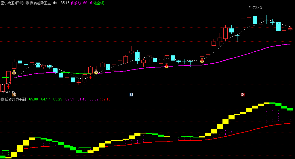 当主图红色做多线和副图黄色K线第一次产生共鸣时,系统会发出一个“钱袋子”信号,这通常被视为一个强烈的买入信号。