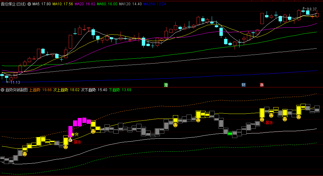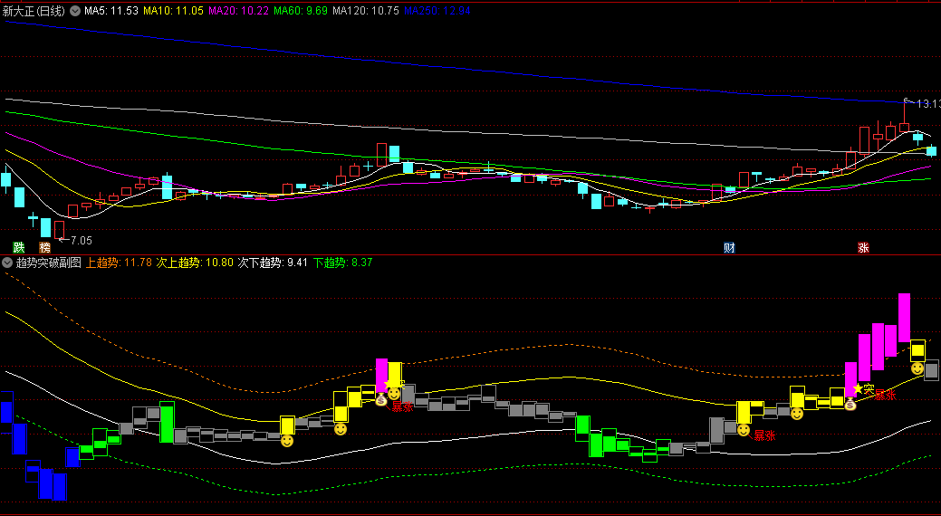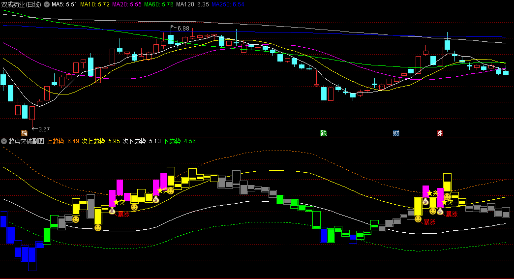 〖趋势右侧交易法〗副图/选股指标 突破上趋势红色K钱袋子 突破次上趋势黄色K笑脸 通达信 源码