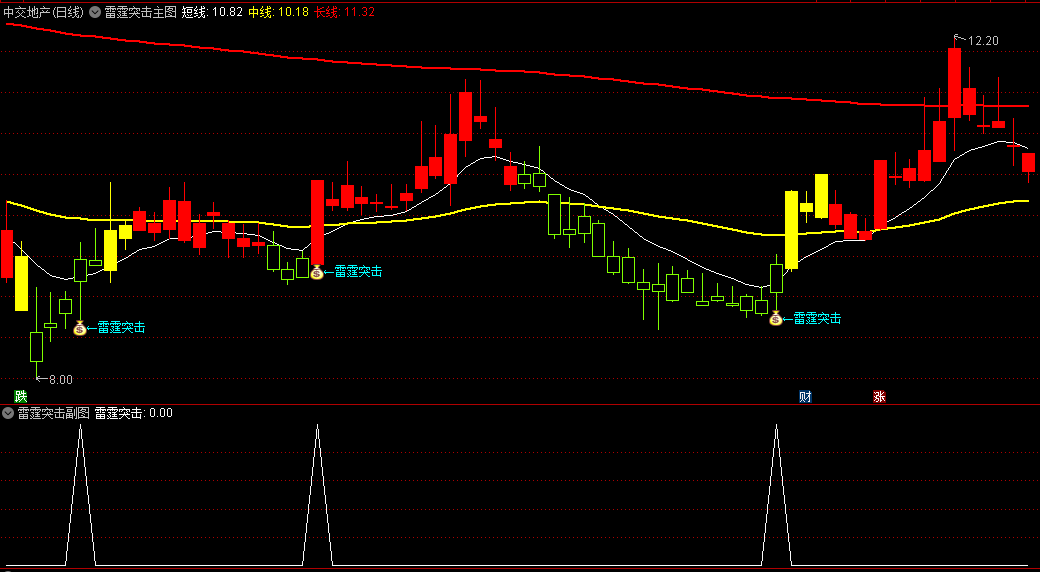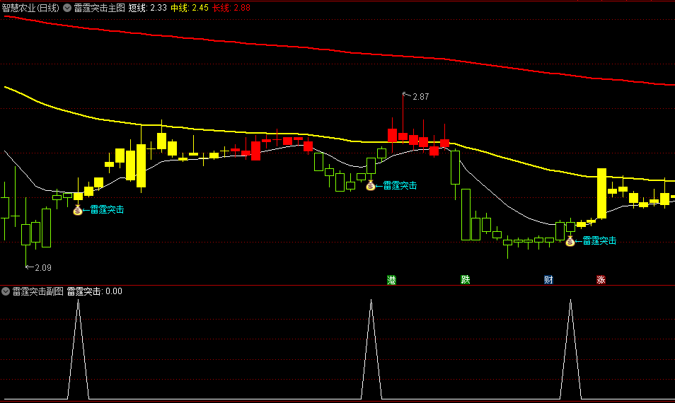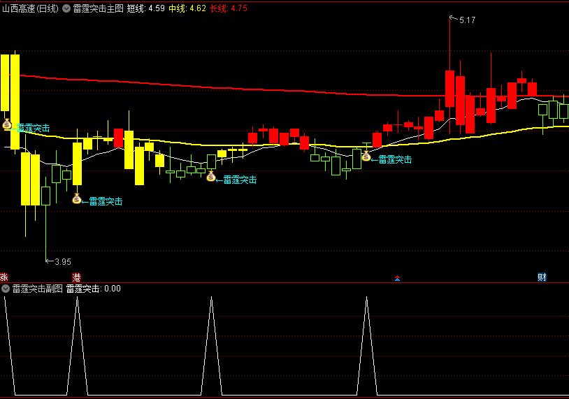 此指标专注于选取出现“钱袋子”信号时的股票。当该信号在主图上显示时,会标注“雷霆突击”字样,以提醒投资者关注潜在的买入机会。