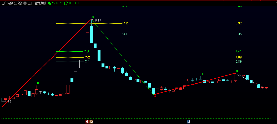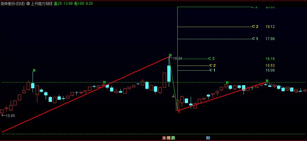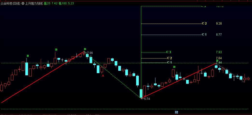 通达信上升阻力划线主图指标依据波动速率原理,通过分析价格数据,找出近期价格波动的高点和低点。波动速率通常指的是价格在一定时间周期内上涨或下跌的速度,反映了市场的活跃程度和价格变动的趋势。