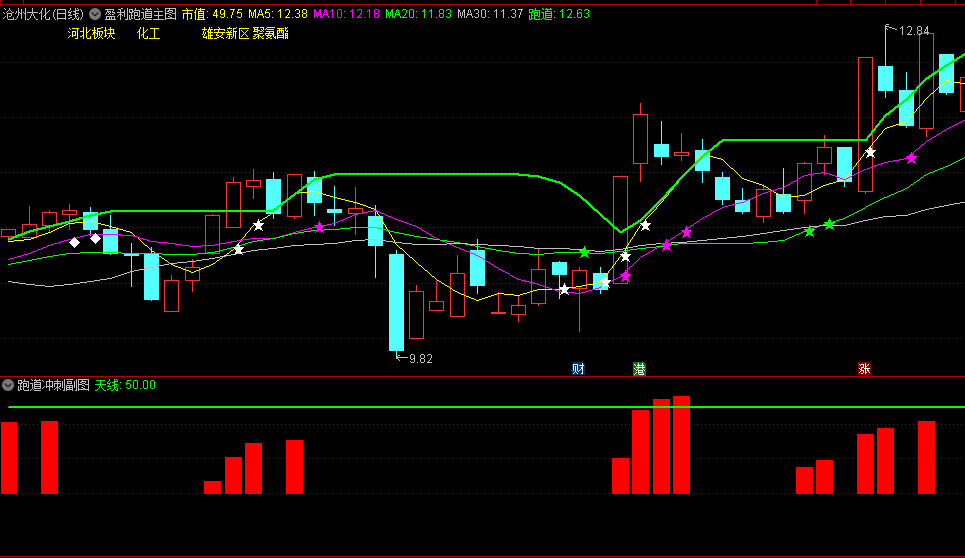 在这20只股票中,寻找那些同时满足上述主图和副图指标的股票,即股价站上了“跑道”且红色柱状图突破了“天线”的股票。这些股票就是当前值得关注或介入的强势股。
