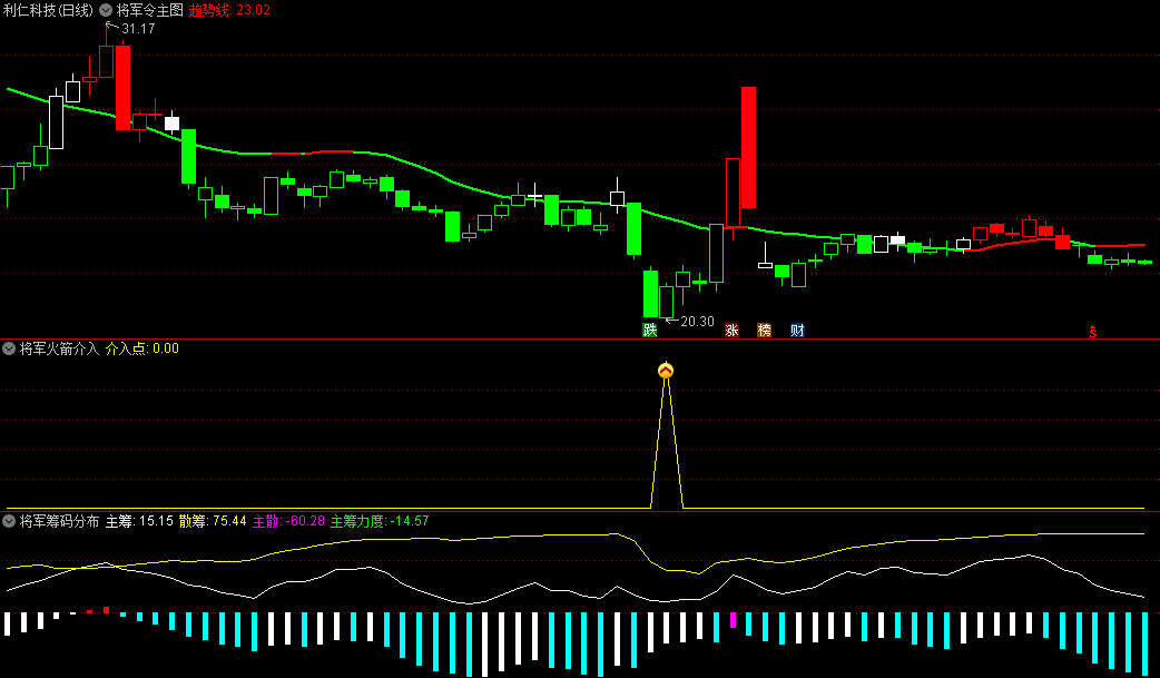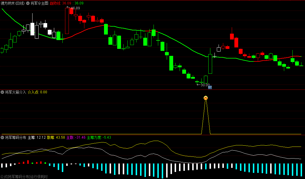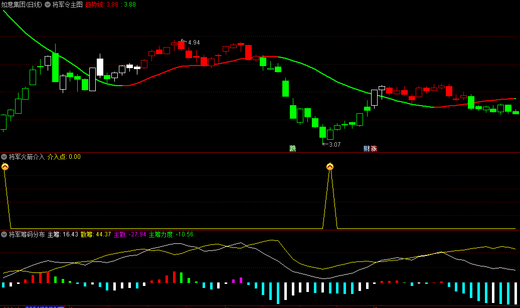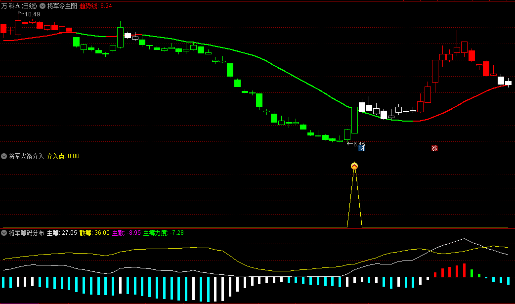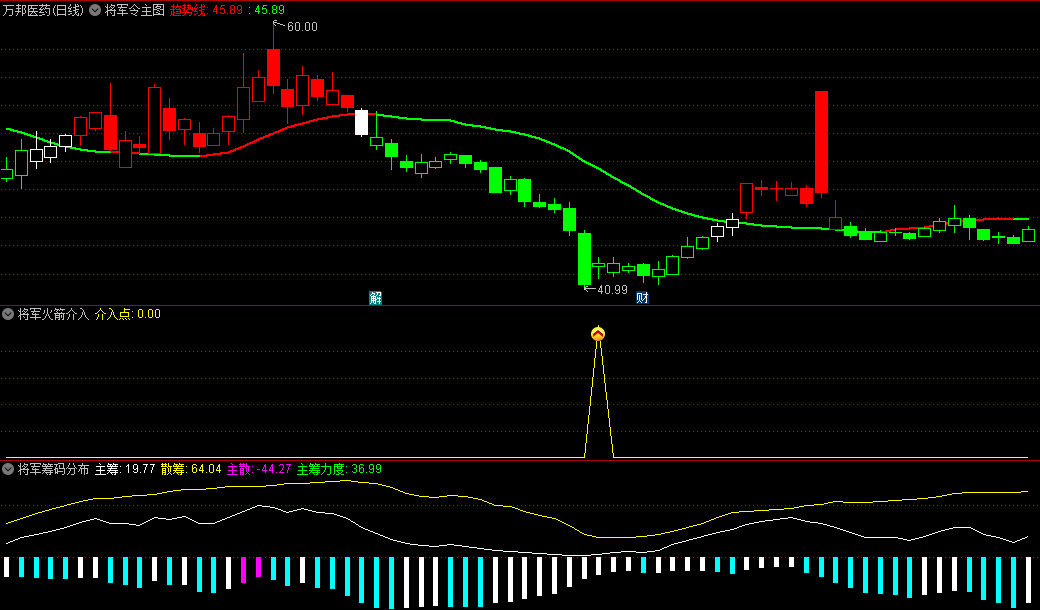 一个主图和四个副图组合的套装指标,分别是将军令主图、将军换手率副图、将军火箭介入副图、将军筹码分布副图、将军熊牛副图、将军火箭介入选股。