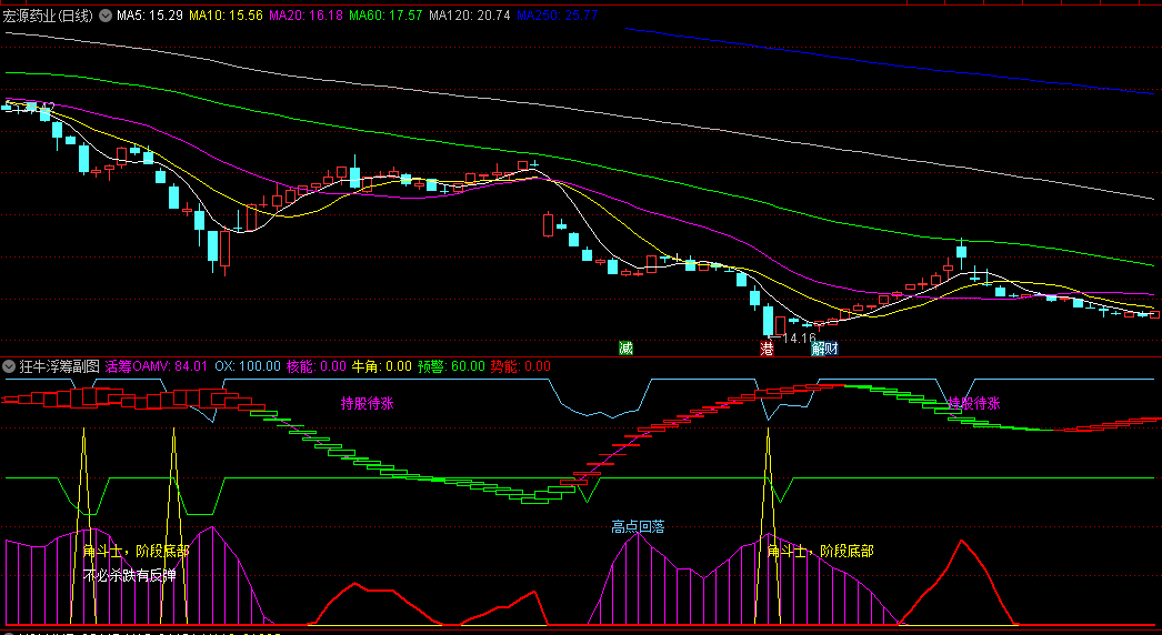 趋势买卖指标:狂牛浮筹副图指标中的活筹代表趋势,以红绿颜色区分股价运行方向。红色代表下跌趋势,绿色代表上涨趋势。这种直观的颜色区分,使得投资者能够迅速判断股票的当前趋势,为买卖决策提供参考。
