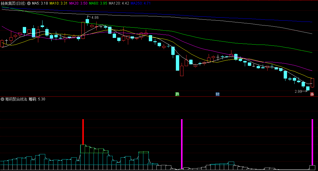 紫色柱子表示底部买入信号:当指标中出现紫色柱子时,这通常表示股票已经到达了一个相对低位,是一个较好的买入时机。投资者可以根据这个信号进行买入操作。
