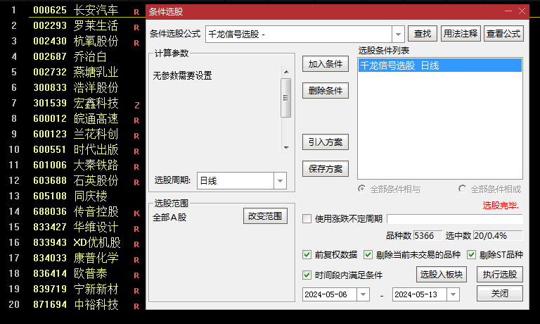 选股器精准:选股器是千龙聚首指标套装的另一大亮点。该选股器基于MACD指标和其他相关条件,能够筛选出符合特定买入的股票。这些选股信号经过验证,具有较高的准确性,有助于投资者发现市场中的优质投资机会。