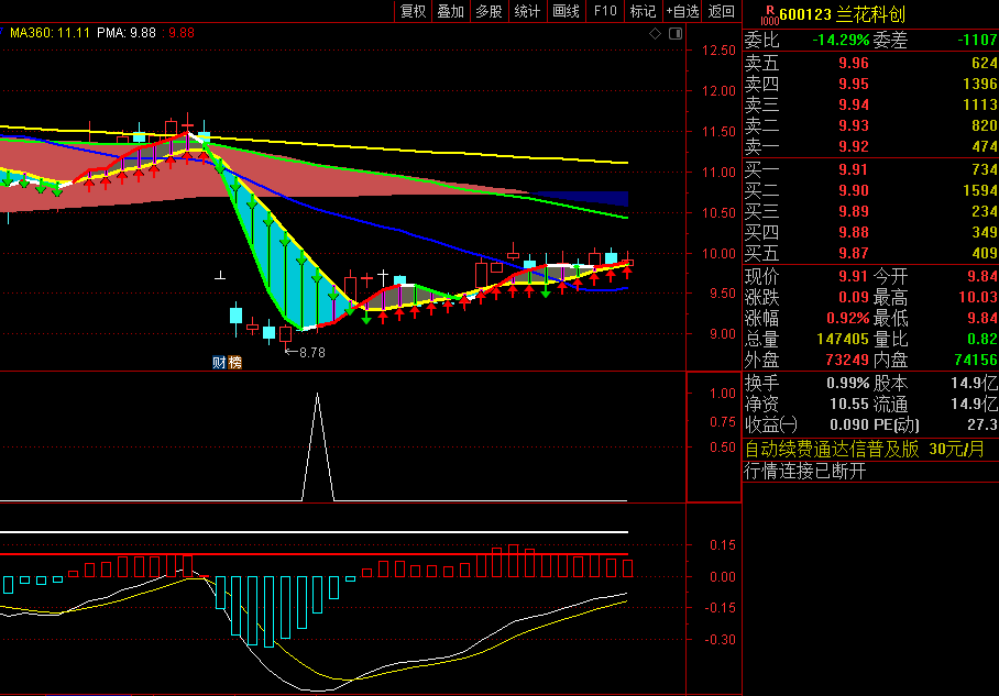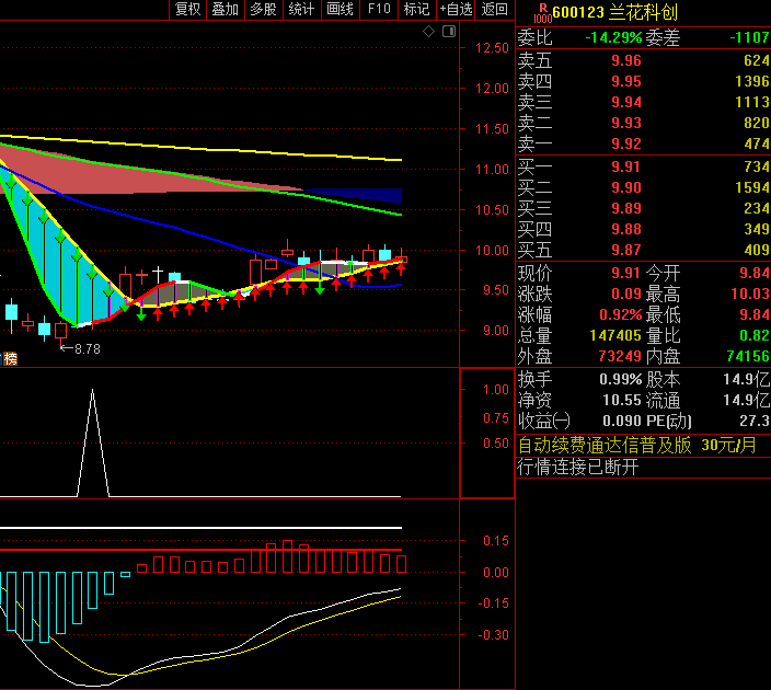 主图分析:主图部分利用MACD指标,结合特定的算法和参数设置,能够准确判断股票的底部和顶部位置。当股票达到入底或入顶条件时,主图会给出明确的信号,为投资者提供买卖点的参考。