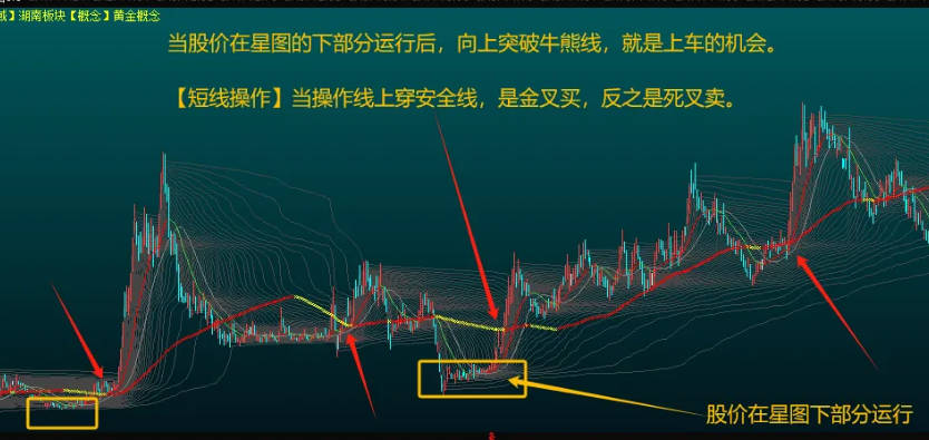 当股价在低位筹码运行后,向上突破牛熊线时,就是由弱转强的变盘点,再结合短线操作。