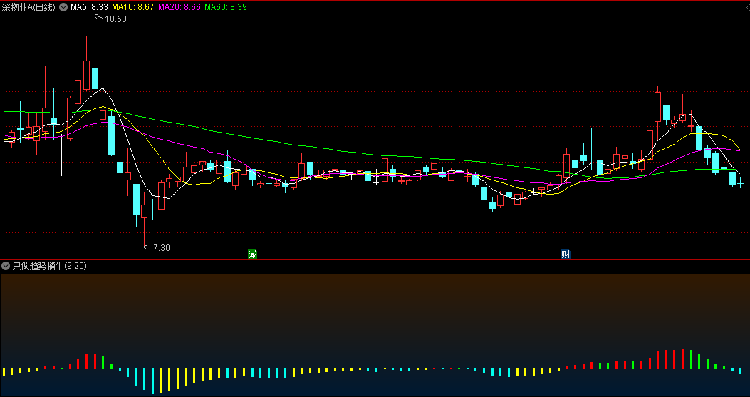 观察量柱颜色:在副图中,量柱的颜色变化代表了股票的趋势和强度。当量柱从负轴变化到正轴时,颜色会经历淡蓝色、黄色、红色、白色、紫色、绿色的变化。