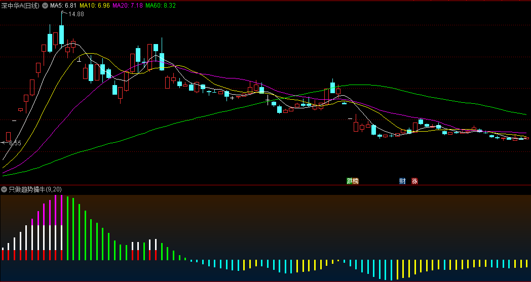 卖出时机:如果量柱从紫色转为绿色,这通常是一个卖出信号,表明股票从强势转为弱势。