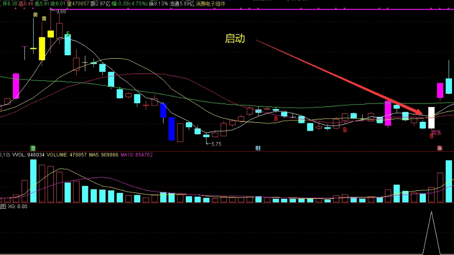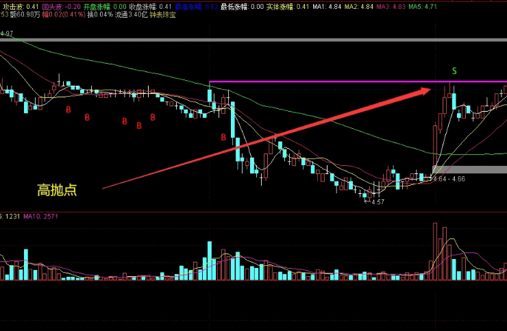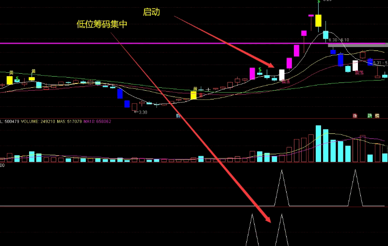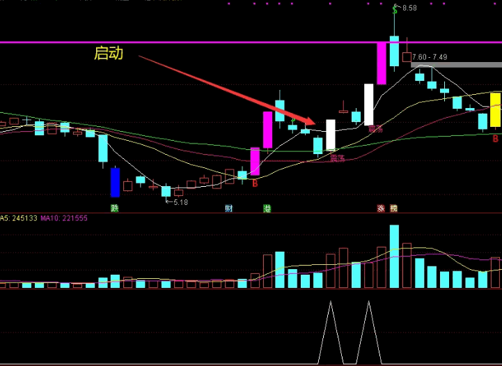 出手就挣主图说明:紫色K线位涨停,蓝色K线为大面,黄色K线是盘中曾触及涨停收盘没涨停,白色K线为反包。