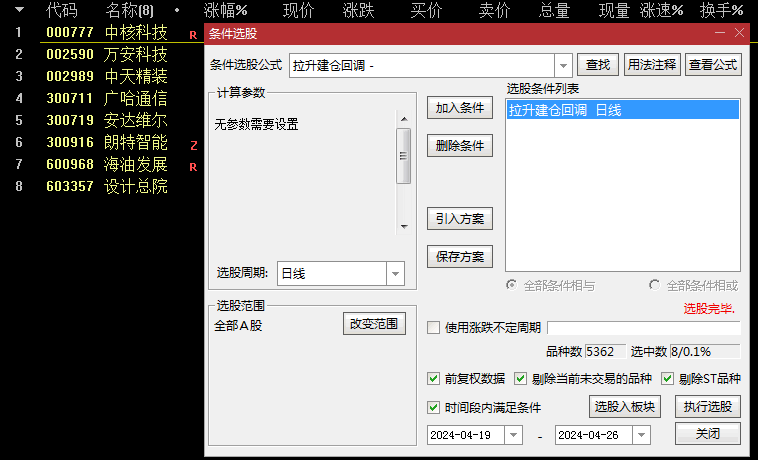 今天这个作品是自己原创的,主打一个洗盘回调再拉升,就是找那些主力资金有介入,但主力在试盘后马上有洗盘的品种!