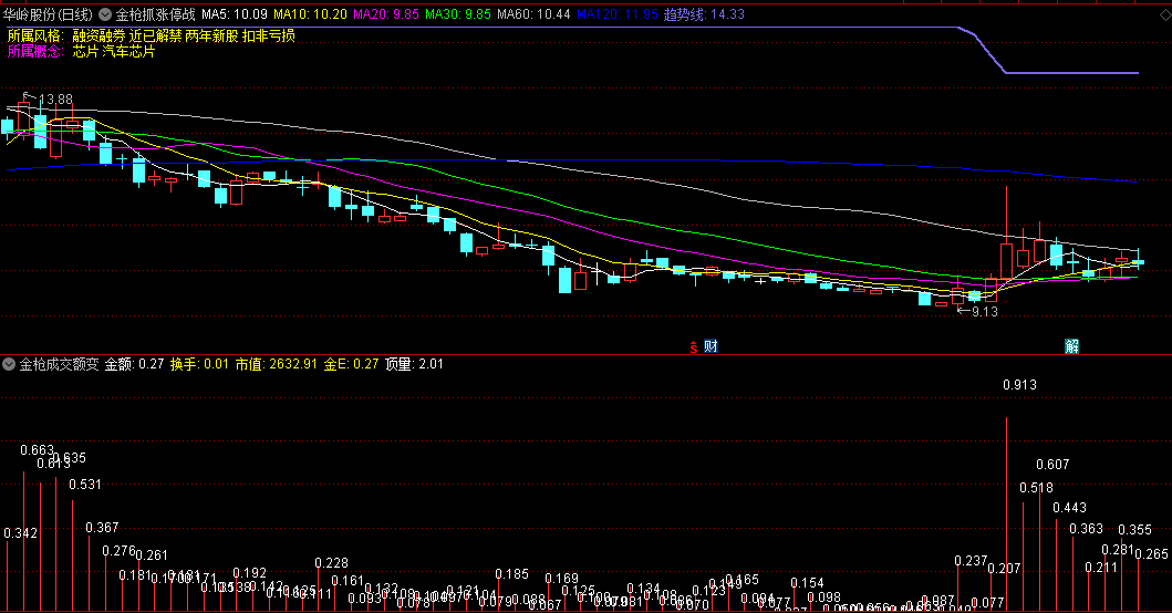 当金枪信号出现时,若股价放量突破主图中的趋势线,或已运行在趋势线上,这是一个重要的买入信号。