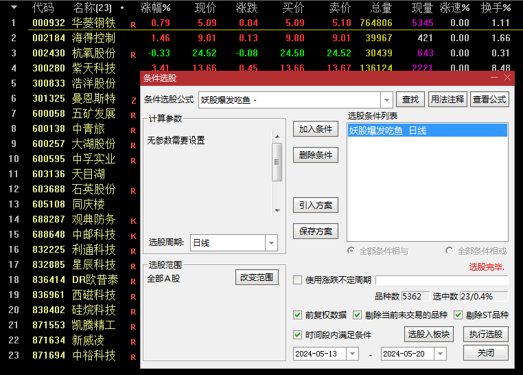 在执行条件选股后,应进一步结合其他技术分析指标(如MACD、RSI等)、基本面分析以及大盘环境等因素来综合判断。