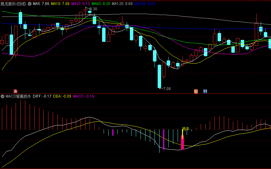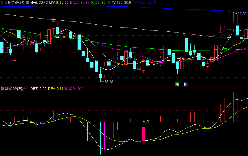寻找买入点:当股票经过一段时间的下跌或整理后,若MACD指标与股价之间出现底背离现象(即股价创新低,而MACD指标未创新低,甚至开始上升),且此时DIFF线上穿DEA线形成金叉,则视为买入信号。此时,指标会发出“找牛”的文字信号,提醒投资者关注该股票。