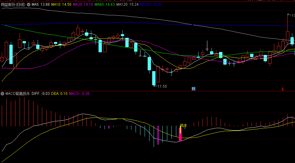 背离技术:背离是技术分析中的一个重要概念,指的是价格与指标之间的走势不一致。MACD背离找牛副图指标特别关注MACD指标与股价之间的背离现象,以发现潜在的强势上行走势。