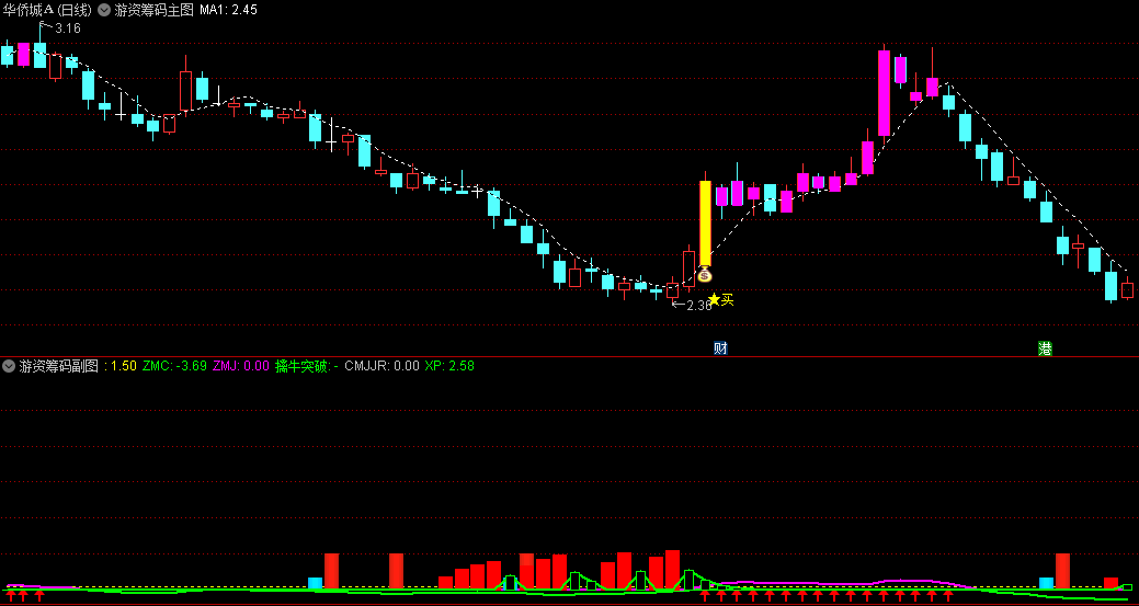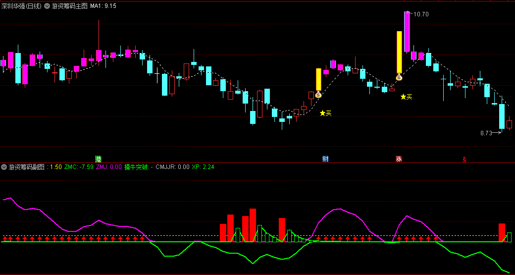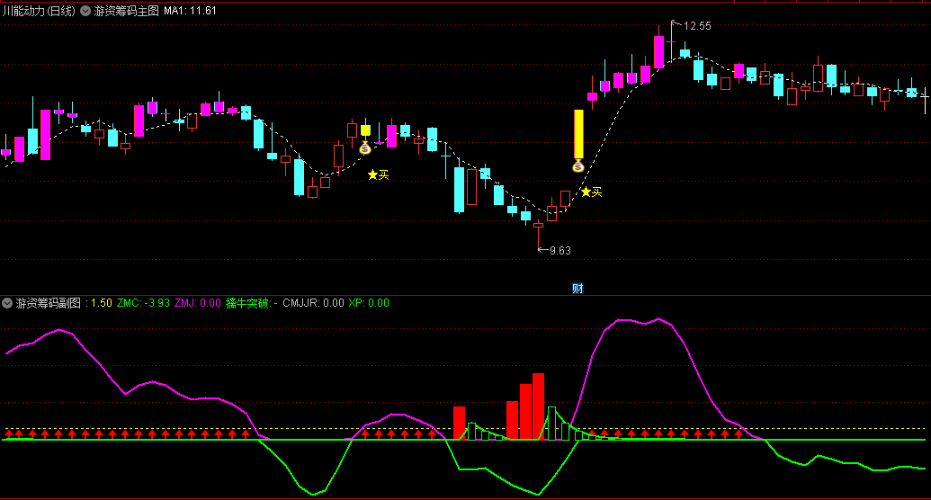 〖游资筹码〗主图/副图指标 主图钱袋+副图红箭头信号=关注信号 通达信 源码