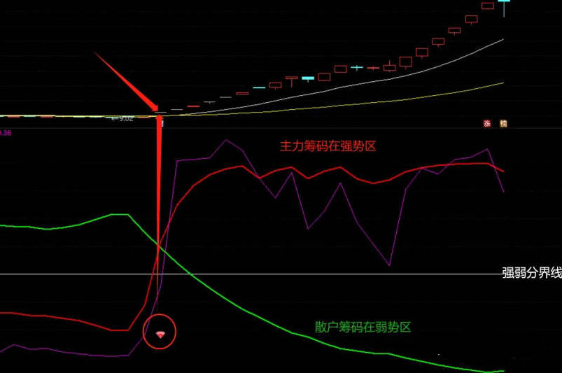 红线(主力筹码):代表主力资金的筹码分布情况,当红线在强弱分界线上方时,表示主力筹码较为集中,个股有上涨的潜力。
