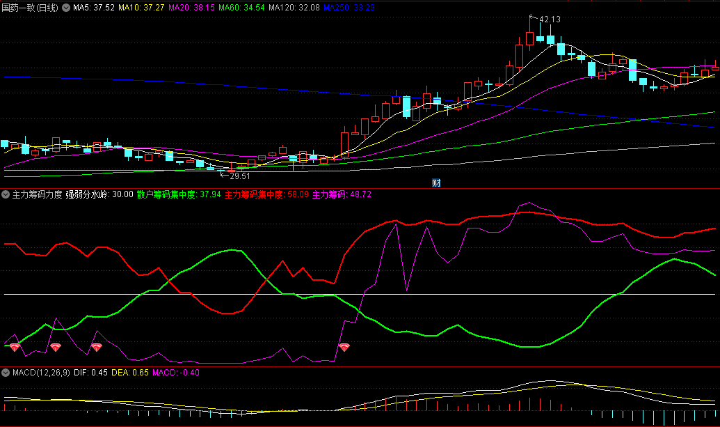 白线(强弱分界线):以30为界定值,用于区分主力筹码和散户筹码的强弱。当主力筹码和主力筹码集中度在白线之上,而散户筹码在白线之下时,通常认为个股有走牛的动向。