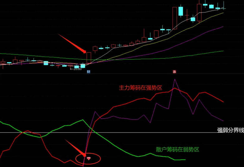 绿线(散户筹码集中度):代表散户资金的筹码分布及集中度情况,当绿线在强弱分界线下方时,表示散户筹码较为分散,有利于主力资金的运作。
