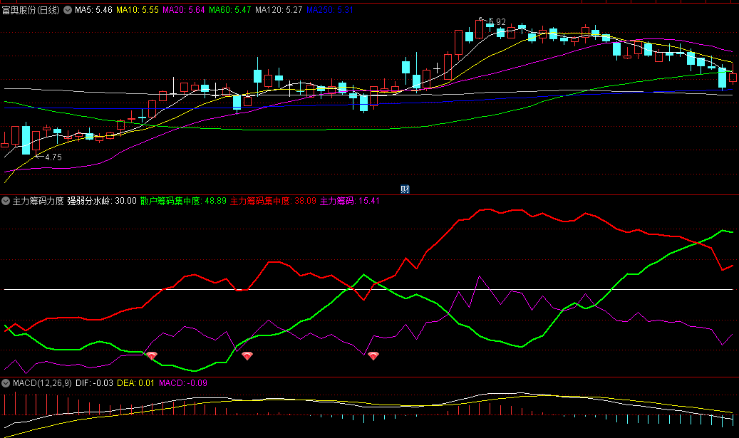 洋红色线(主力筹码集中度):用于衡量主力筹码的集中度,集中度越高,说明主力资金对该股的掌控力越强。