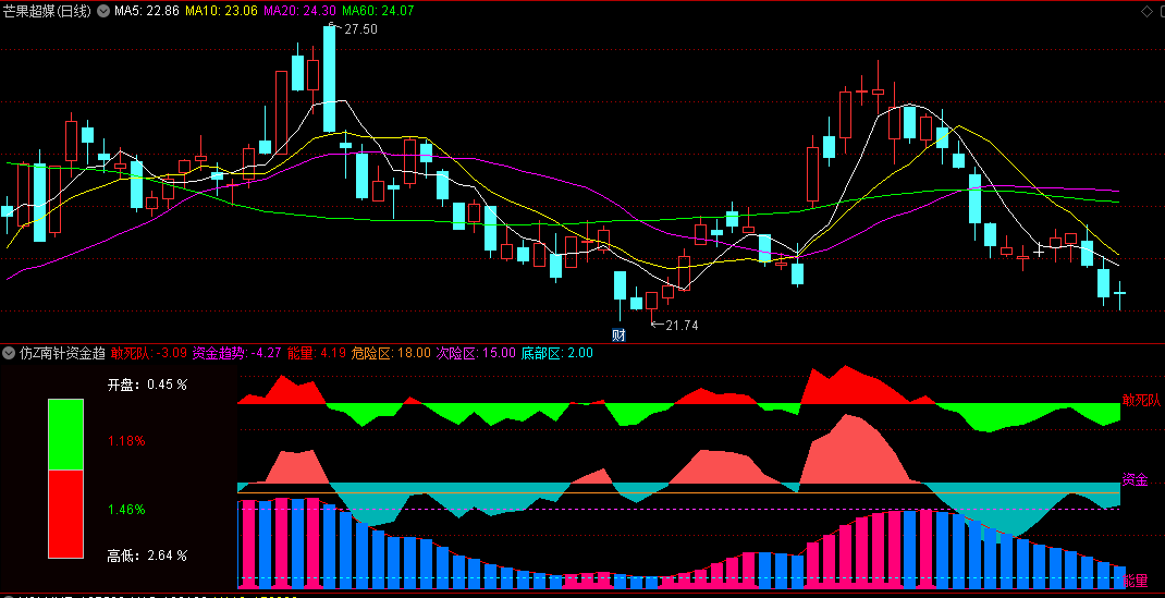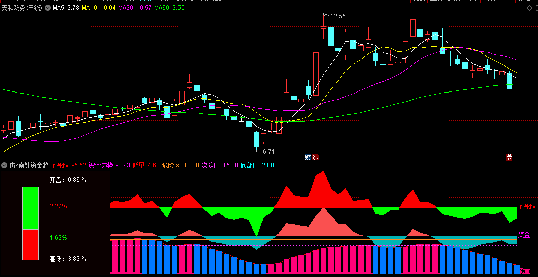 敢死队资金监测:敢死队资金是市场中的一类重要资金力量,其动向往往能够影响股票的短期走势。本指标特别加入了敢死队资金监测功能,通过特定的图形和颜色标识,让投资者能够一眼看出敢死队资金的进出情况,为短线操作提供重要参考。