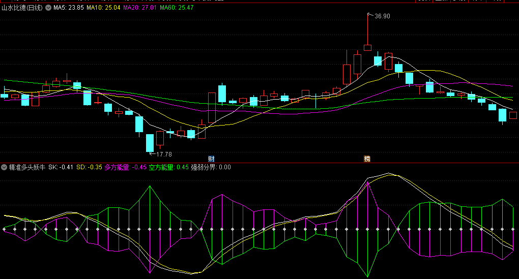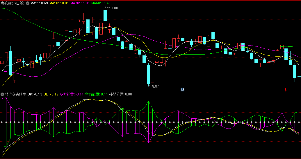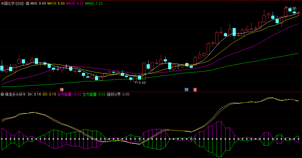 4、中线持股:如果紫线在“强弱分界”线上方运行,这通常意味着多方力量较强,投资者可以继续持股。只有当SK与SD形成死叉,或者紫线下穿“强弱分界”线时,才考虑卖出。