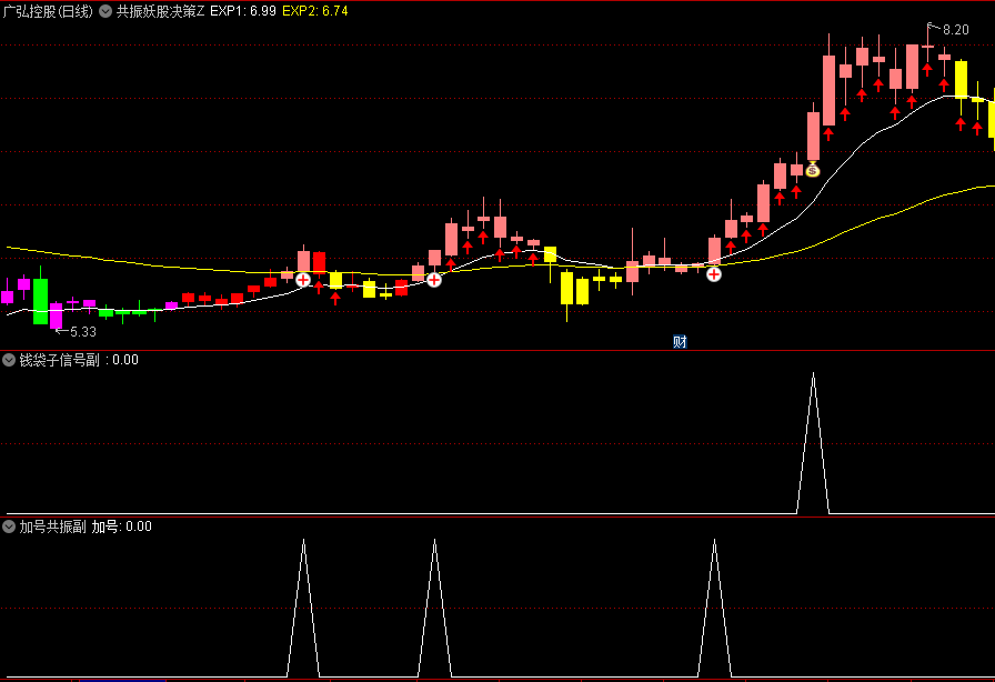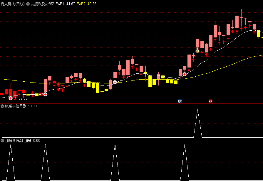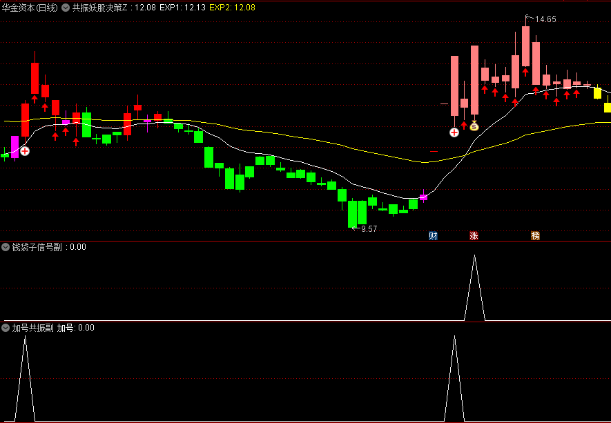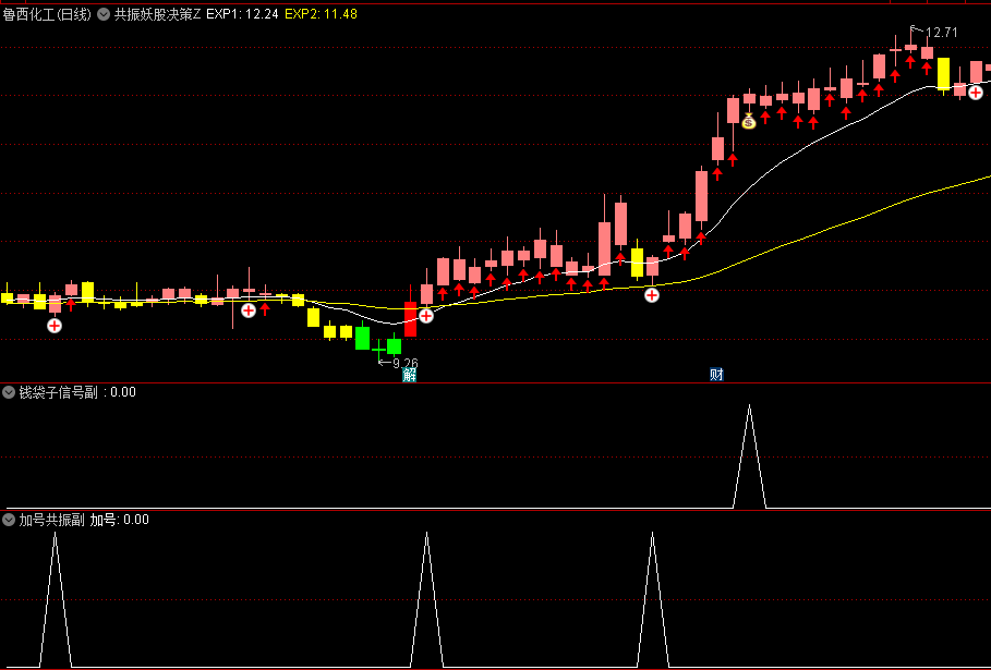 “+”号图标:当主图红K与四量全红共振时,将出现“+”号图标作为加仓或买入的强烈信号。这种共振现象表明多方力量强势且资金全面流入,为投资者提供了明确的买入机会。