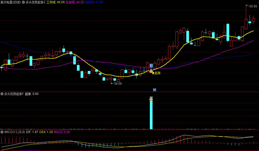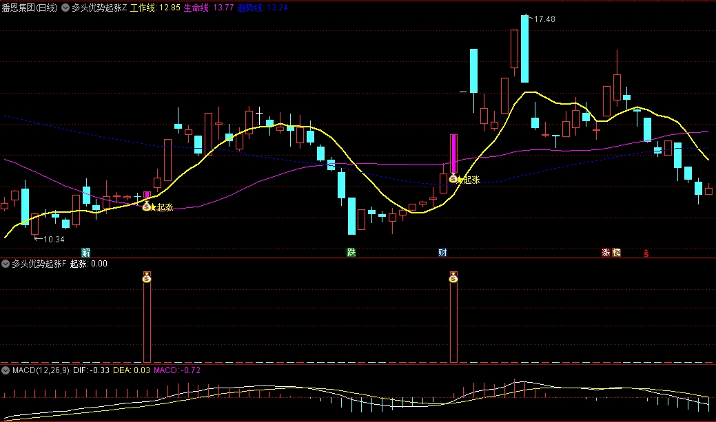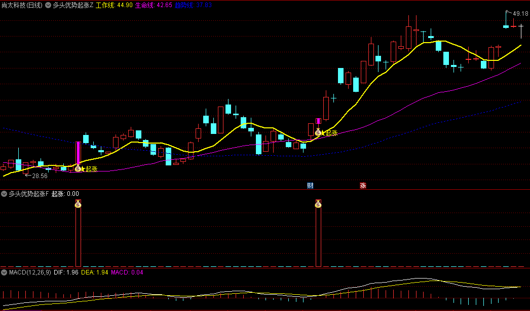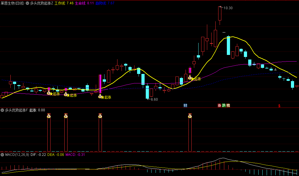 生命线:在多头趋势下,生命线是判断股票走势强弱的关键。当“钱袋子”起涨信号出现在生命线上方时,说明股票处于强势区域,上涨的可能性更大。