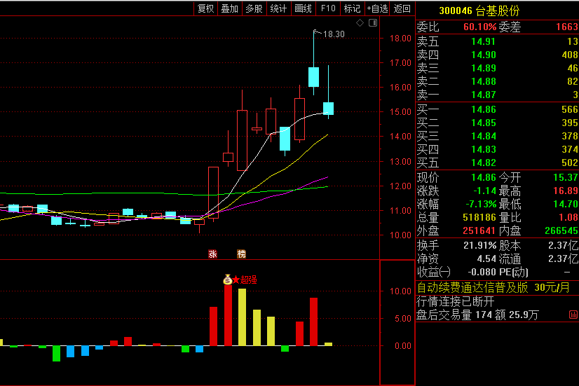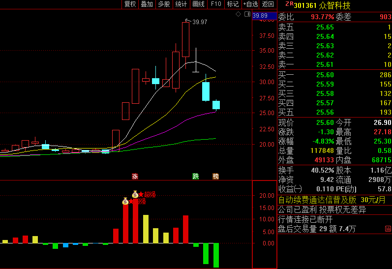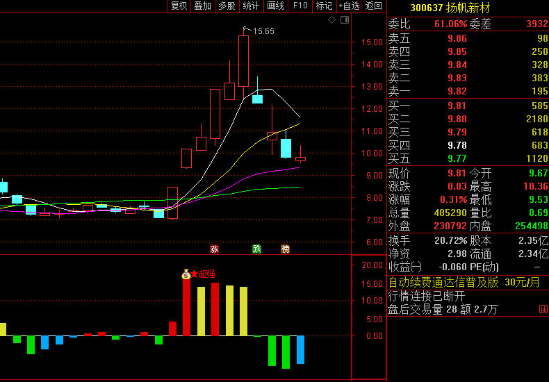 直观明了的量能指标:弱转强,1、红柱为“强动能”;2、黄色为“中动能”;3、绿柱为“无动能”;4、蓝柱为“弱动能”;5、钱袋子为“超强”。