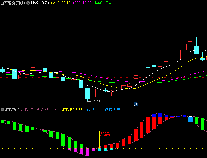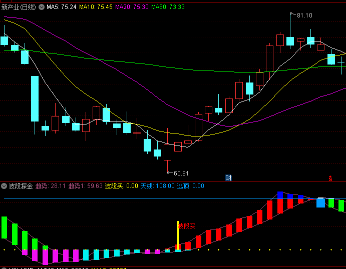 一、当趋势强度线与底部界限交汇,形成黄色棒线,并伴有“波段买”的提示,便是潜入市场的良机。