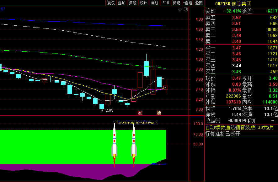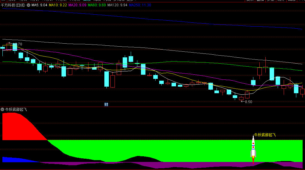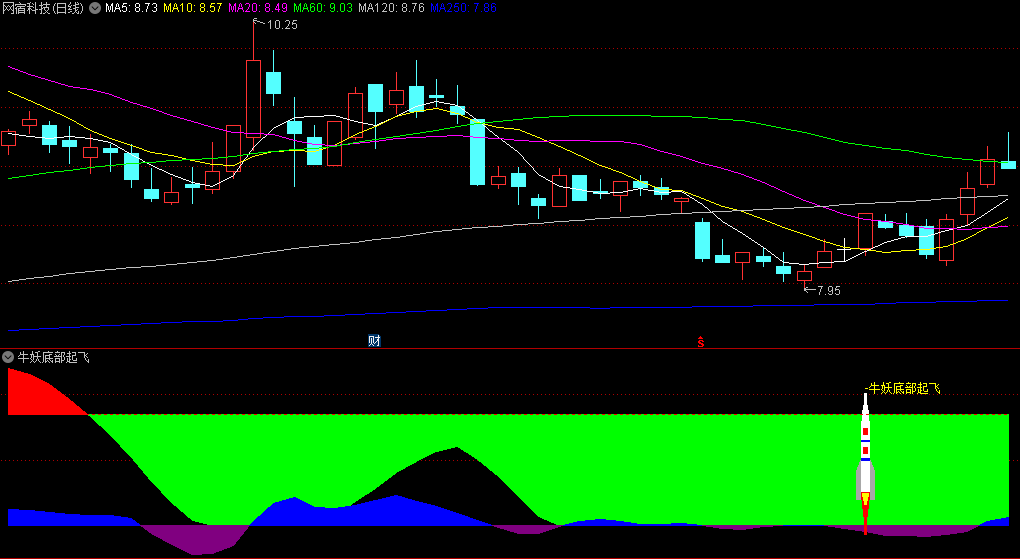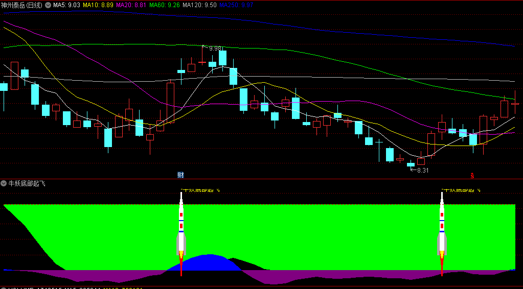 火箭标识:此指标的核心是起飞的火箭标识,它作为一个重要的底部信号,通过精确计算股价的变动来预测底部的可能性。
