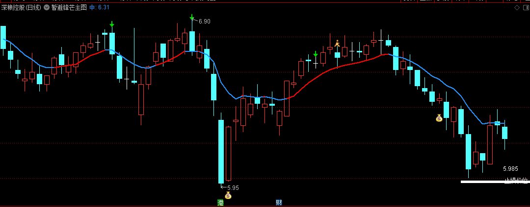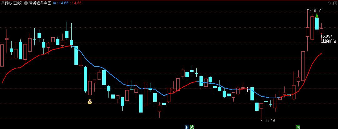 买入信号:虽然“暂避锋芒”指标主要用于预判顶部,但它也提供了买入信号,即“钱袋子”提示。这些买入信号相对较少,但一旦出现,其精准度也相当高,值得投资者关注。