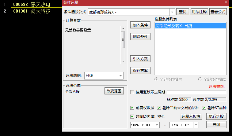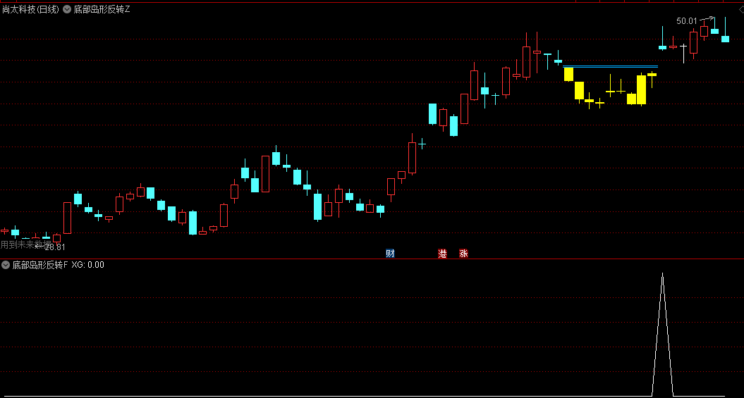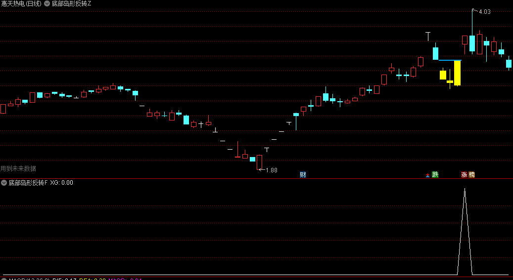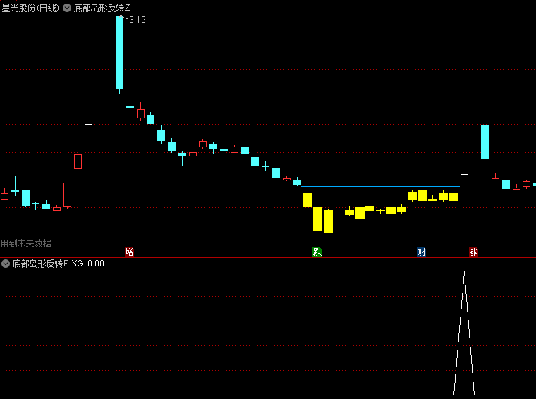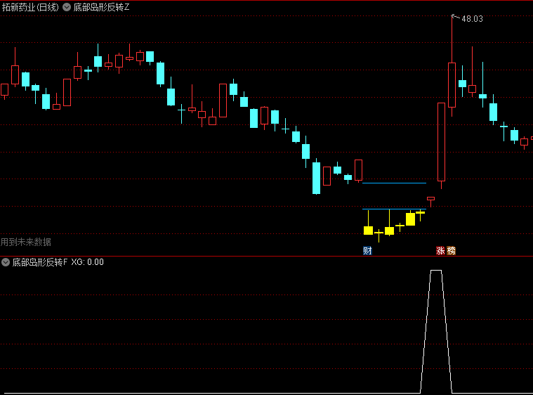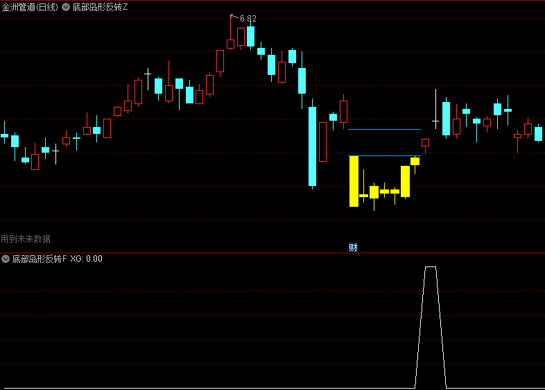 底部岛形反转指标主要用于发现底部岛形反转股。该指标主图虽含有未来函数BACKSET,但不影响其效果。BACKSET函数主要用于标示K线模式,特别是当组合K线模式形成后,为了完整标示,需要向前赋值。例如,“三只乌鸦”K线模式,必须等第三根K线形成后,该模式才算成立,并从第一根K线开始标示,这就需要向前移动。底部岛形反转指标也是基于这一原理设计,用于标示岛形反转形态。由于岛形反转确立后才作为买入信号,所以形成过程中的信号变化并不影响最终使用效果。