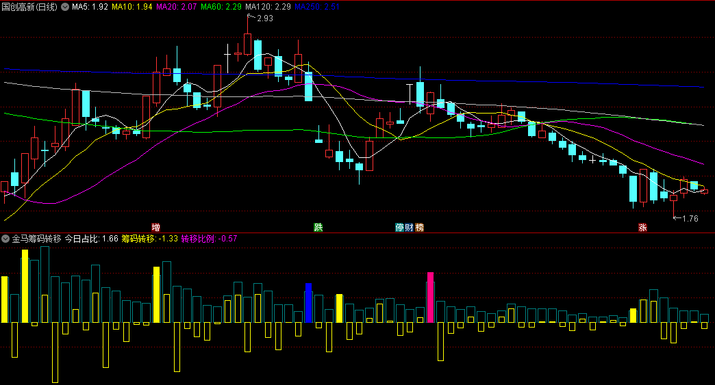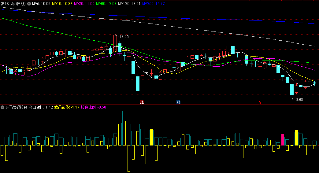 某金钻故弄玄虚的【金马筹码转移】副图/选股指标,送给大家研究筹码转移,附送第一次突破选股源码!