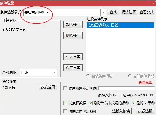 本公式可以去除掉一些风险股,而且由于是通达信本身自带的扫雷避险,所以可以动态跟随通达信官方更新,相当不错!排除风险股!