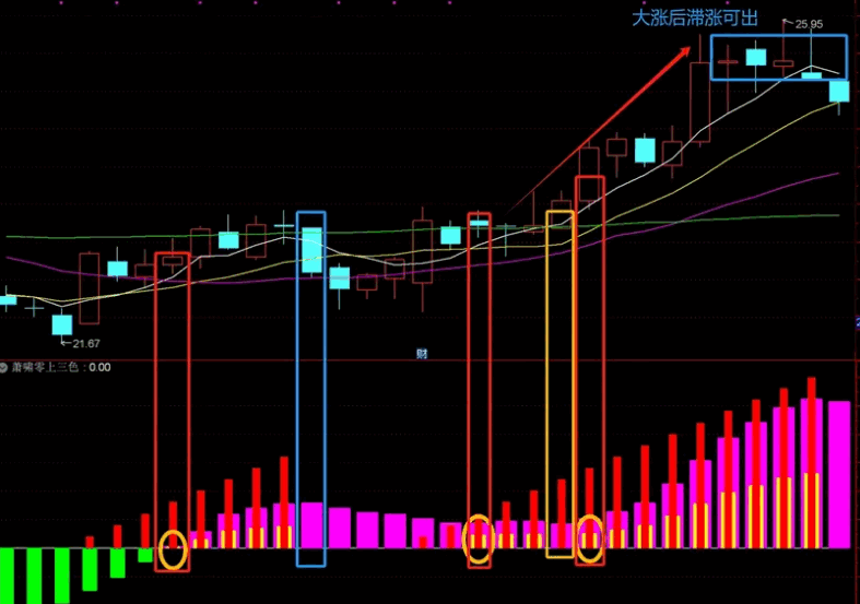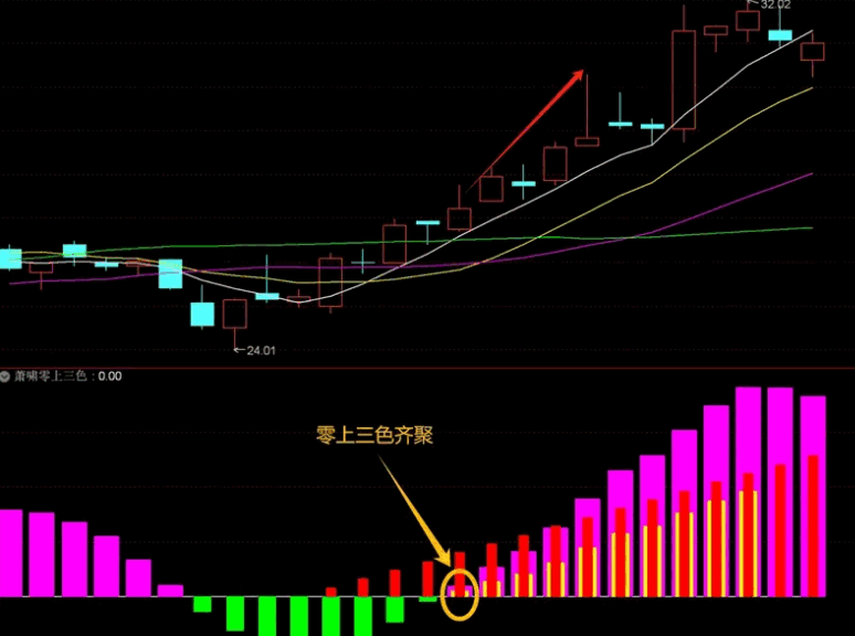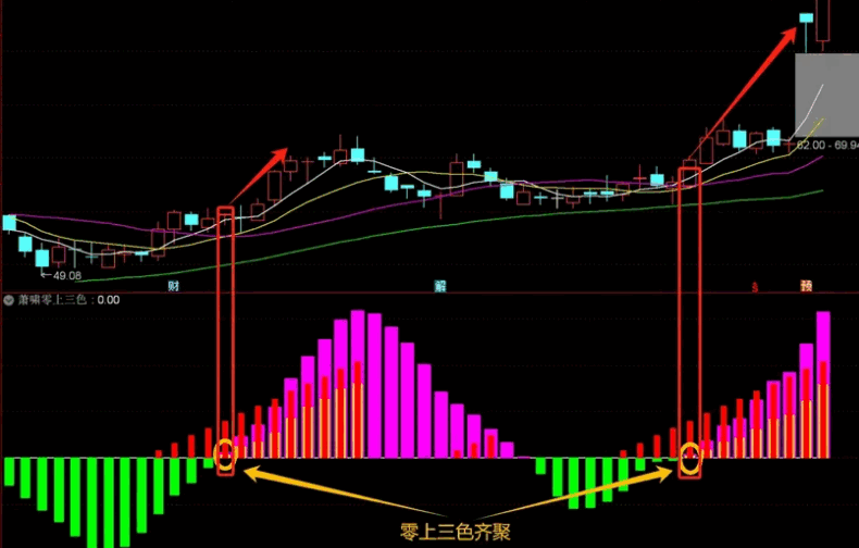 1.整个副图上只有四种颜色的柱体,我们只要在0轴上方同时聚齐粉黄红三种颜色的柱体就行。