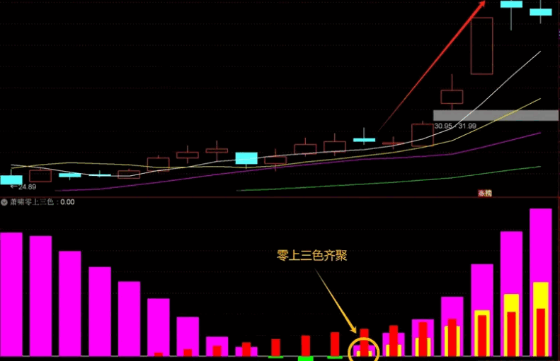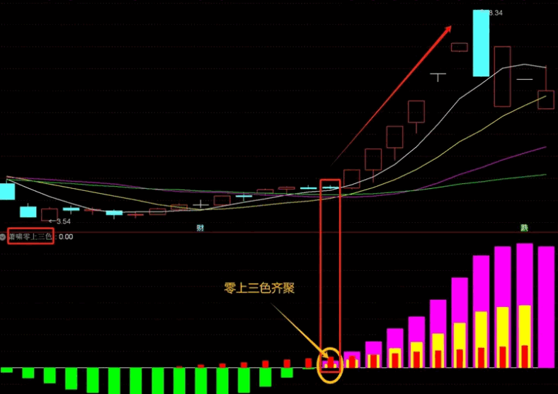 2.通常我们从第一根三色齐聚的柱体位置上车,选股信号就是零上第一根三色柱。