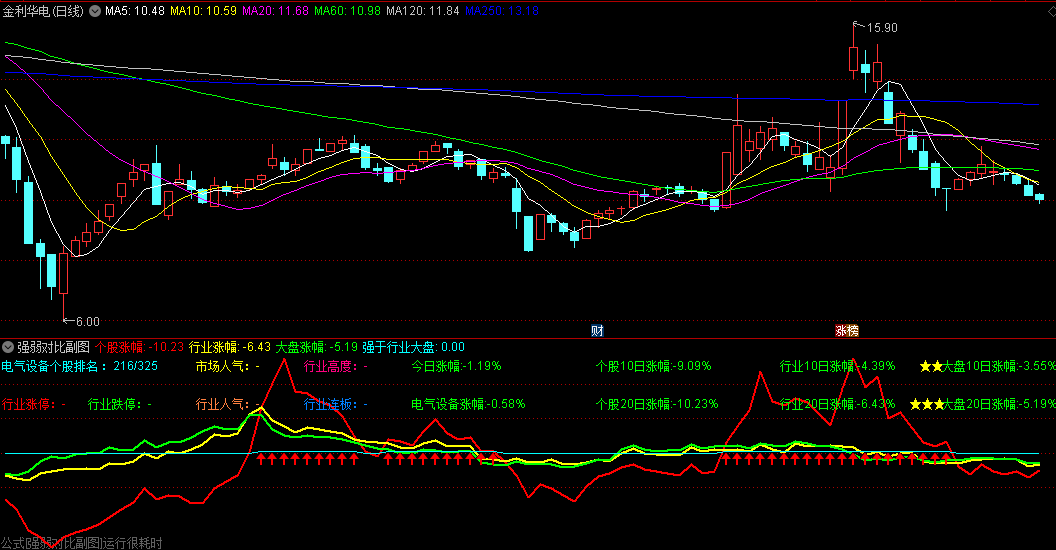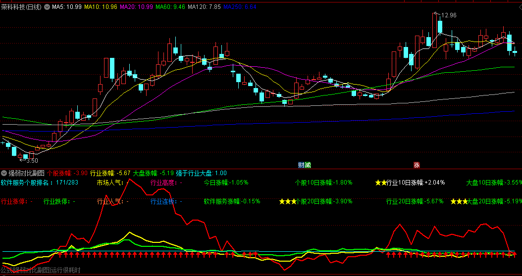 右侧显示出个股、行业、大盘的10日和20日的涨跌幅(均会变色,且会标记出三者中最强的两方)。
