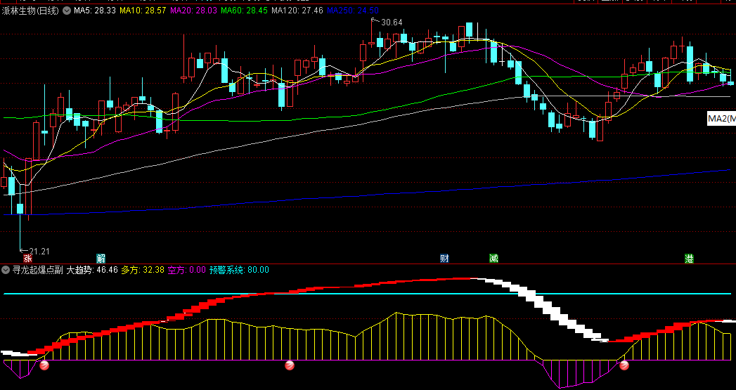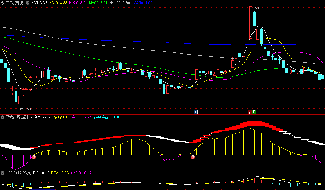 共振起爆点信号:当紫色(多方)和大趋势(红色)同时出现时,指标会发出共振起爆点信号,这是投资者捕捉短期起爆点的关键。这种信号的出现,往往意味着市场多方力量强大,且长期趋势向上,是股价可能即将快速上涨的时机。投资者可以根据这一信号,及时介入市场,获取收益。