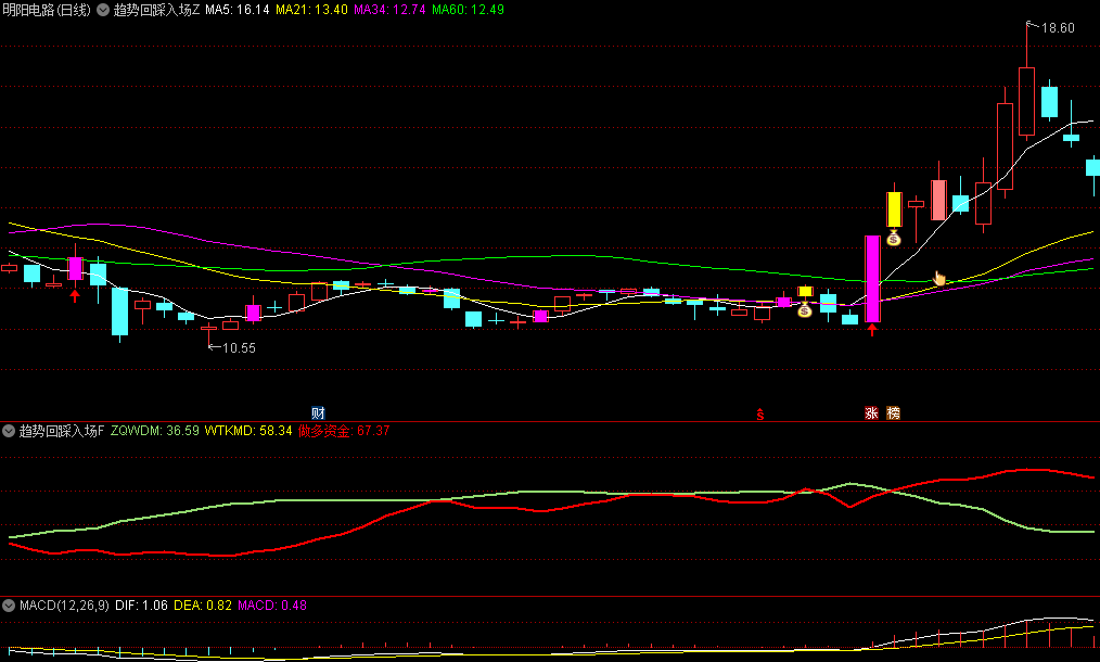“钱袋子”信号:当做多资金活跃并出现异动时,主图上会显示“钱袋子”信号,提示买入机会。