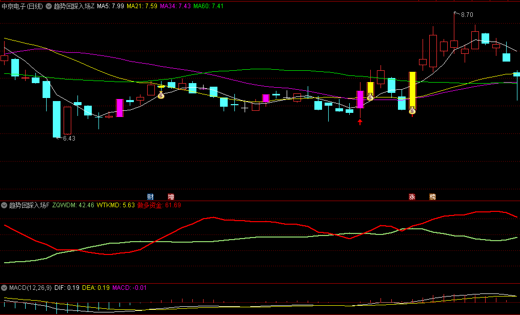 通达信【趋势回踩入场】主图/副图/选股套装指标,基于三条重要均线制作而成,用于短期趋势判断和交易信号触发