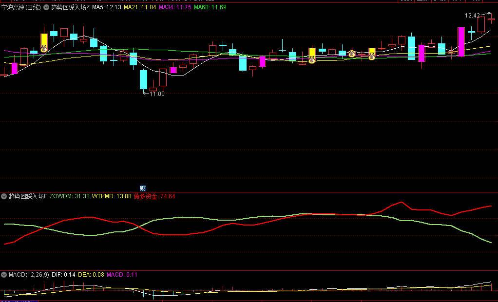三线金叉,多头排列:13日、34日和55日均线形成金叉,且呈现多头排列,这是趋势回踩入场的前提条件。