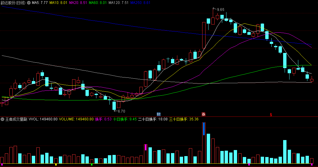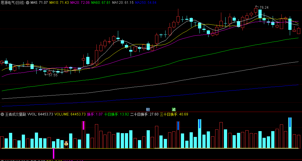量柱上方:粉红色是30日天量、黄色是六十日天量、绿色是一百日天量、蓝色是一年的天量、钱袋为王者买点信号;