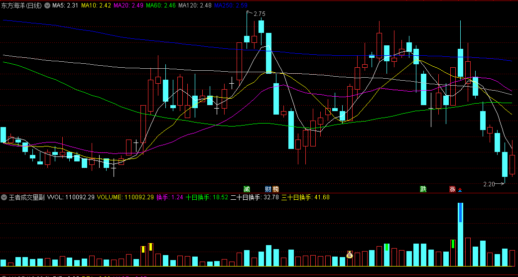 量柱下方:红色是三十日地量、黄色是六十日地量、绿色是一百天地量、蓝色是一年的地量。
