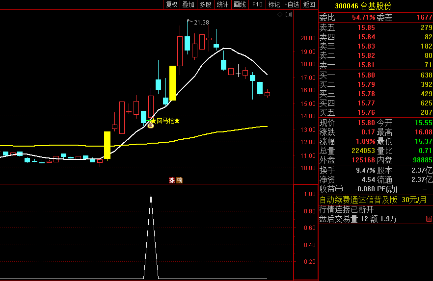 回调幅度:股票回调时,只要不跌破涨停阳线的7%,就值得跟踪。买入价离这个7%的回调线越近越好。