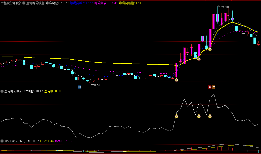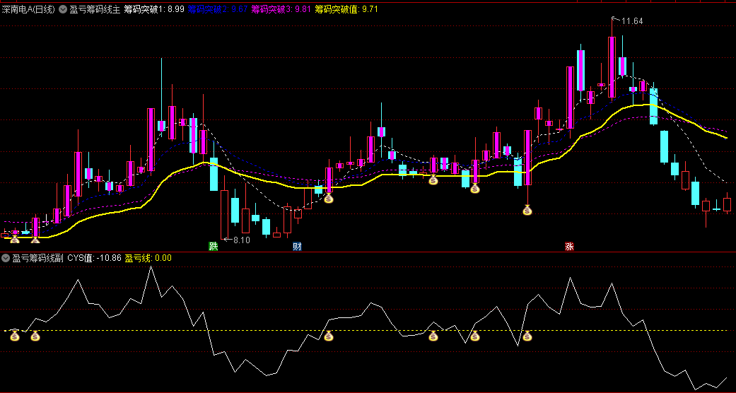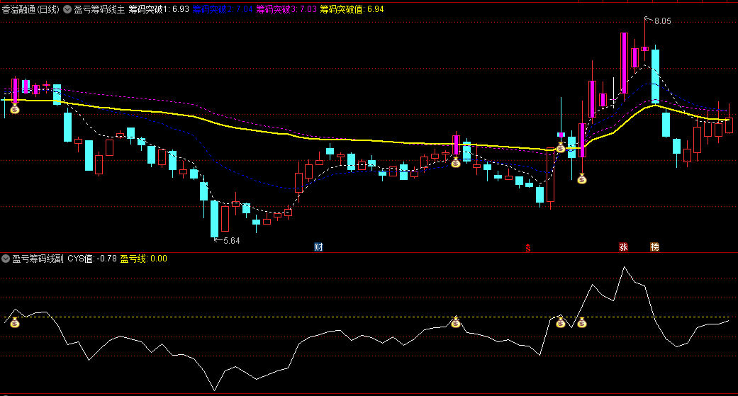 盈亏筹码线主图/副图指标,当股价第一次站上盈亏线,出现钱袋子信号,表明即将开始走强,具有上涨的潜力