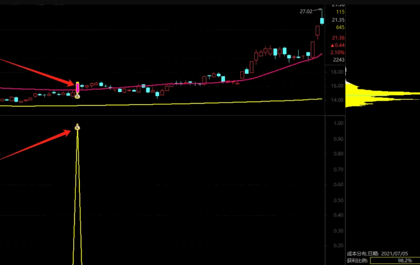基于筹码分析理论的【突破单峰筹码密集】主图/副图/选股指标,识别低位单峰密集形态,捕捉潜在的上攻行情!