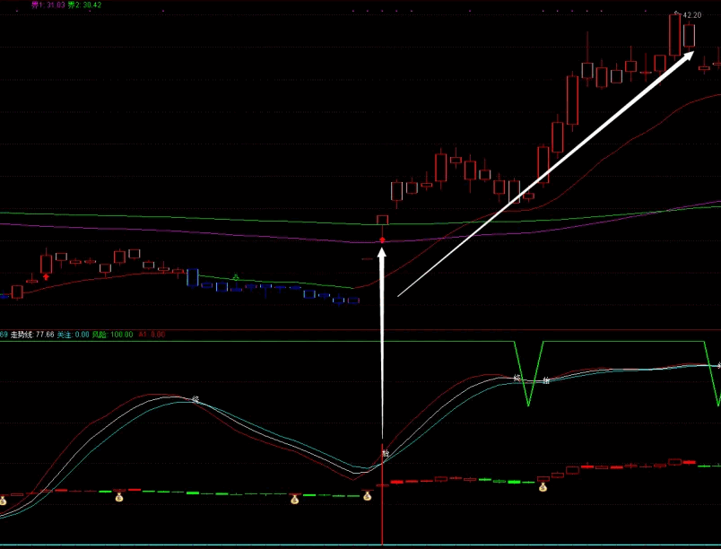 红色箭头出现,为买入时机,表示股价即将上涨,投资者可适时买入。