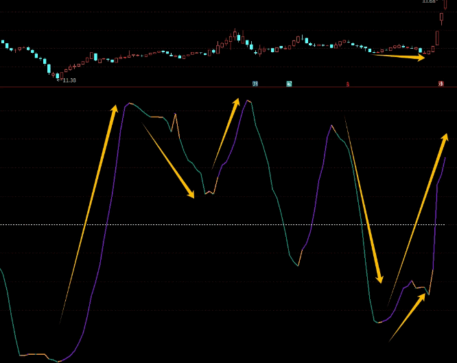 RCI最为直接的交易信号是其与0轴的交叉。具体来说: