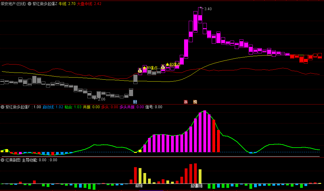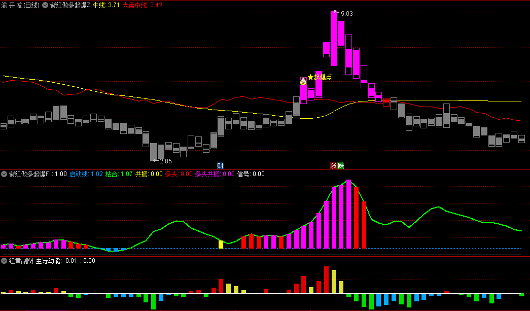 紫红双线:指标中主要包含紫色线和红色线(或可能以其他形式呈现,如指标名称中的“紫红”可能指代不同颜色线的组合,但核心在于双线的应用)。紫色线通常代表股票的长期趋势或强势启动信号,而红色线则可能用于辅助判断短期波动或确认做多信号。